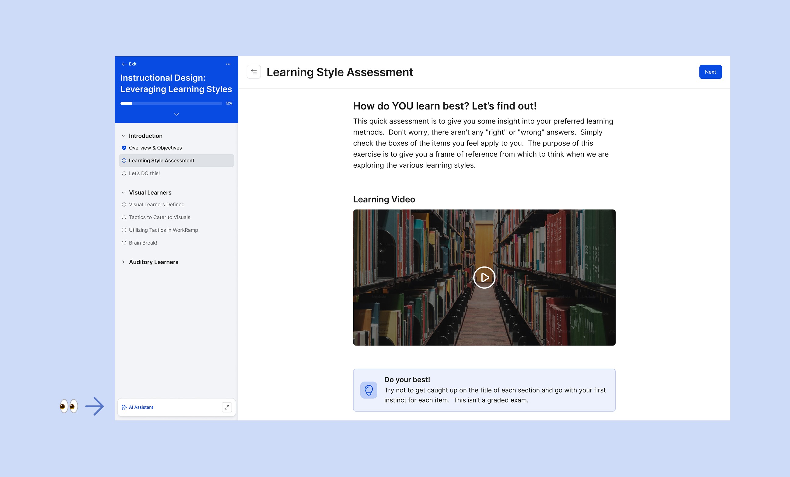 The context: WorkRamp already had AI-generated audio for lesson content. Leadership wanted to expand AI capabilities with an integrated assistant that could support comprehension through flashcard generation, preset prompts, and conversational Q&A.