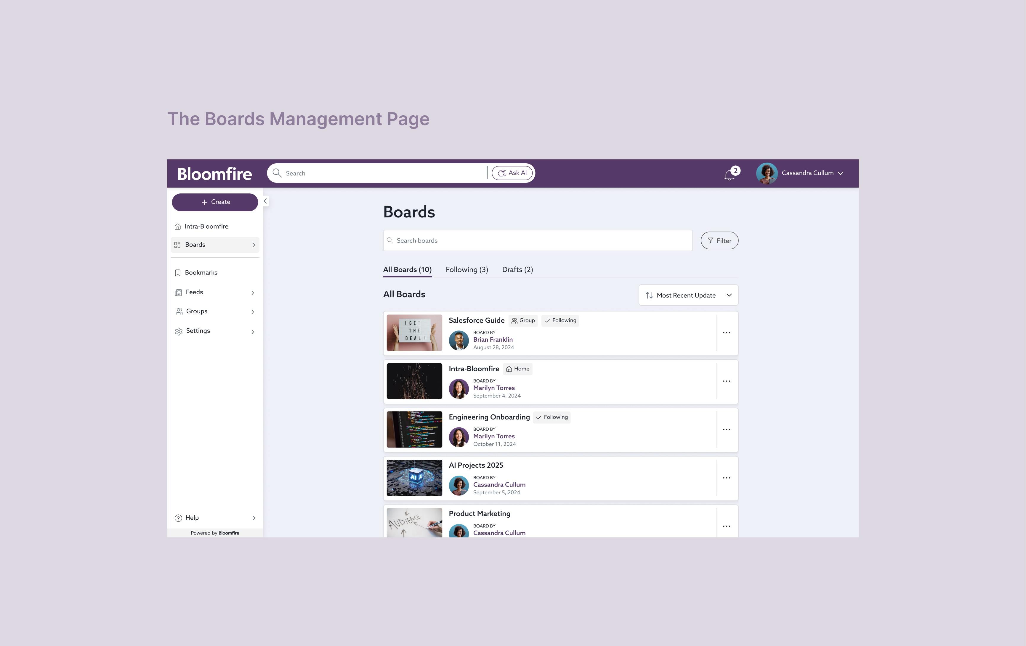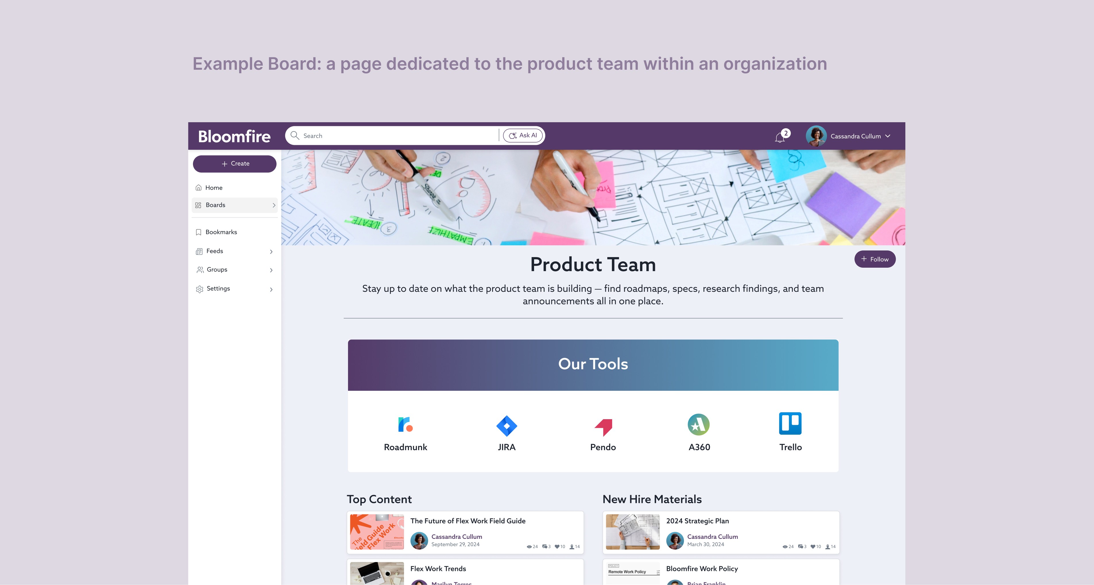 Boards are a new content type in Bloomfire — individual pages that carry the full compositional power of Homepage Builder, plus: