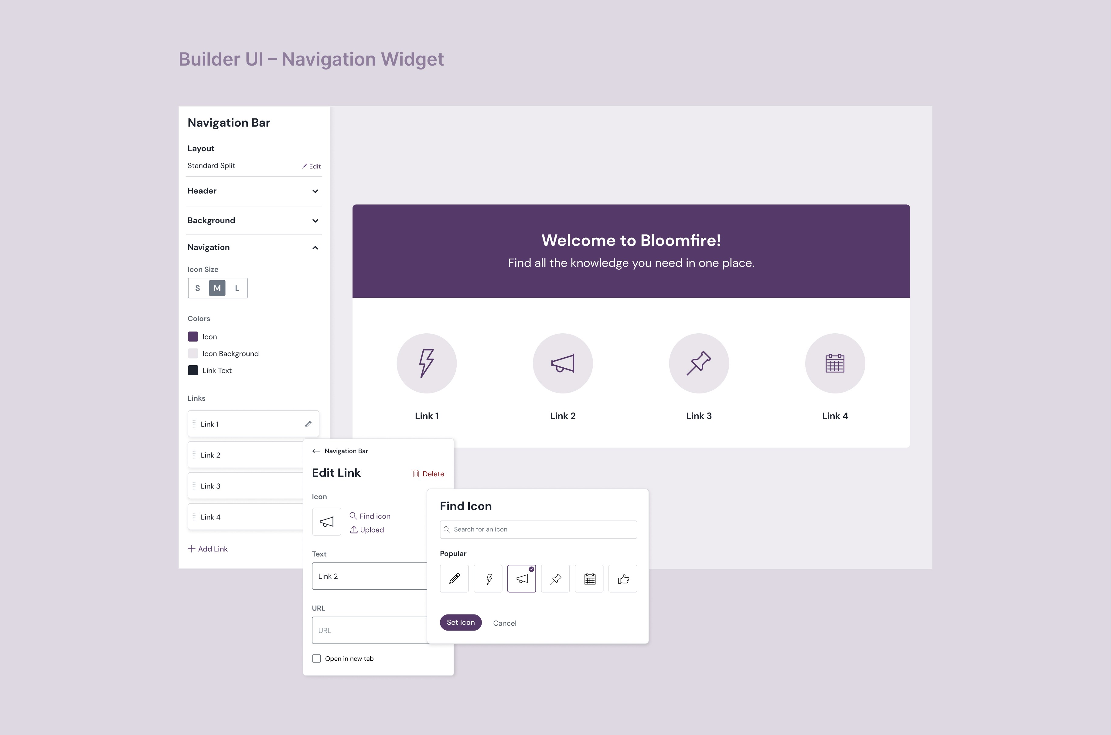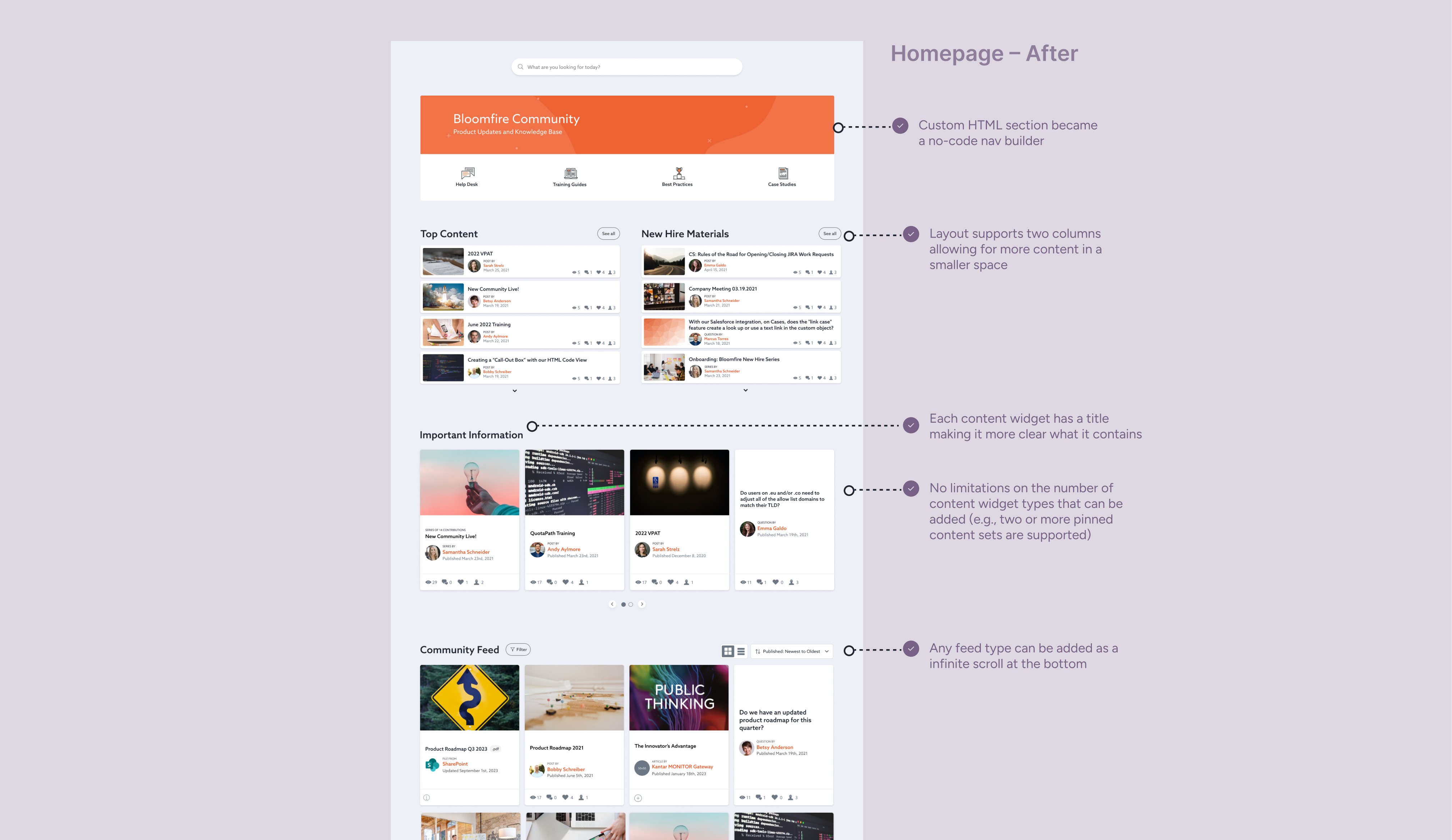 Over the following year, it became standard practice — most accounts I visited in customer conversations had it actively in use. In fact, if a customer didn't have it in use it seemed strange. This validated the direction clearly enough that a page builder feature works well in Bloomfire. But ultimately Homepage Builder only meaningfully changed one page. What organizations actually needed was many destinations.