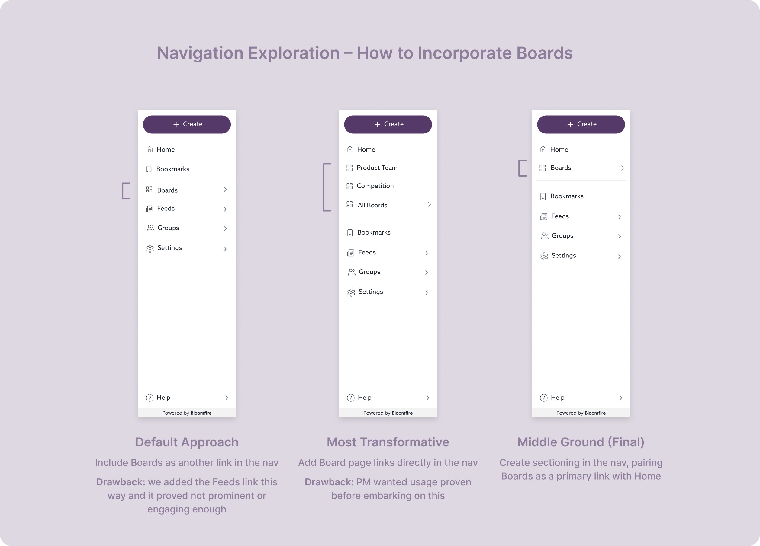 The PM wanted to see usage data before committing to a nav overhaul of that scale — reasonable, even if my concern was that usage would be lower precisely because Boards weren't surfaced prominently enough. We landed on a middle ground: a dedicated Boards link in the nav directly below Home, separated by a horizontal rule. Not the full vision, but a meaningful step in the right direction.